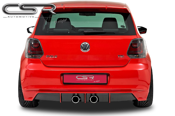 - Abbildungen des Produkts an VW Polo 5 zeigen Endschalldämpfer in Verbindung mit den Endrohren CSR-ZB116 und dem Heckansatz CSR-HA035B
