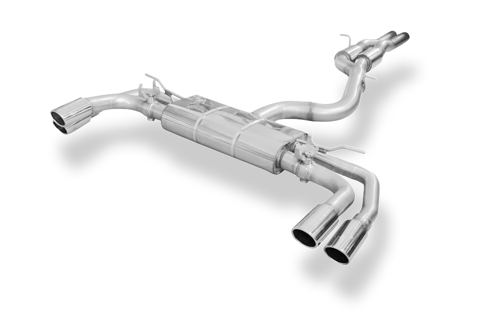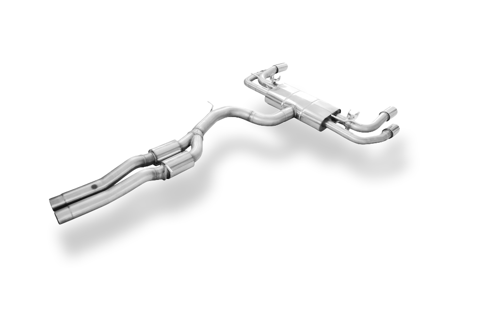 Die Anlage wird in 6 Teilen geliefert: Endschalldämpfer, Vorschalldämpfer und 4 Endrohre die einzeln über Steckverbindungen miteinander verbunden werden. Die beiden Abgasklappen sind von der Firma ASR Component GmbH. Die originalen Motoren werden auf diese gesetzt und verschraubt. Das Öffnen und Schließen erfolgt über die Fahrzeugmodule je nach Geschwindigkeit des Fahrzeuges. Richten Sie zuerst die Endrohre perfekt im Ausschnitt aus, bevor Sie alle Schraubverbindungen Richtung Motor fest anziehen. Achten Sie darauf, dass die Endrohre gut im Ausschnitt sitzen und nicht anliegen. Für die Pflege der Endrohre empfehlen wir einen handelsüblichen Edelstahlreiniger um die Anlage optisch schön zu