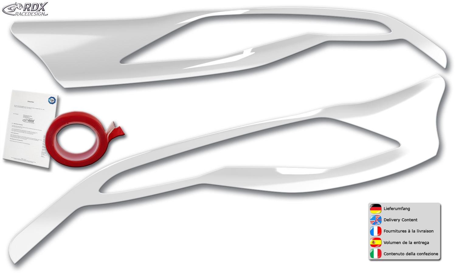 > Die Scheinwerferblenden werden einfach mit dem beiliegenden Montageklebeband auf das Scheinwerferglas geklebt