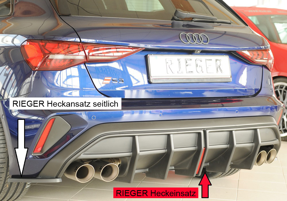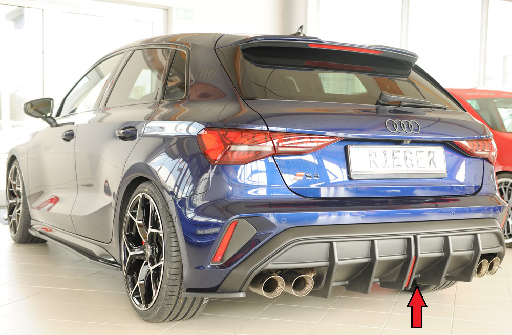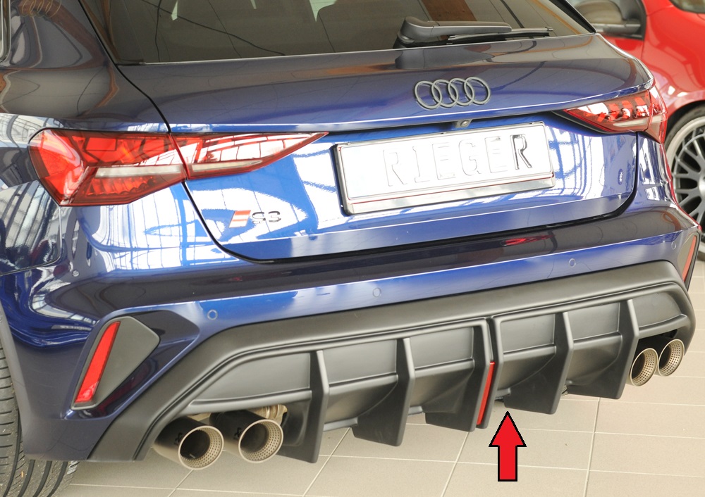 Inkl. Reflektor mittig (vertikal). Nicht für Fzg. mit AHK. Gutachten gültig bis 255 km/h V-max. Passt auch bei Fzg. mit sensorgesteuerter Heckklappe (= öffnen der Gepäckraumklappe durch eine Fußgeste (Kick-Bewegung)). Heckeinsatz passt bei Audi A3 (GY) Lim./Sportback, ab Facelift, nicht S3 mit S-Line Heckschürze nur in Verbindung mit Sport-Endschalldämpfer links/rechts, (4x100x81mm oval), (4x90mm ø), im S3-Look .